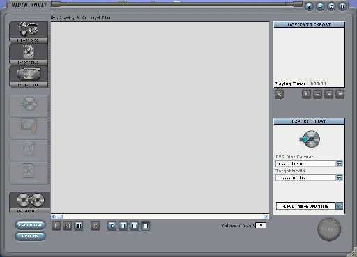The main Video Vault interface is quite easy to understand. On the left you have several Import and Export buttons. However you cannot use the Export buttons yet because you have no movies in your Vault. Import disc will allow you to import VCD and SVCD discs which can then be converted to DVDs or to several devices.